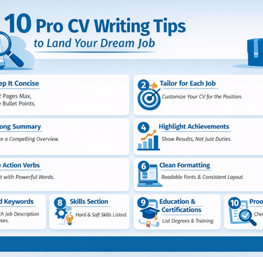 Learn 10 expert CV writing tips to craft a professional resume that stands out. Boost your chances of landing local and international jobs with actionable advice, examples, and keyword strategies.