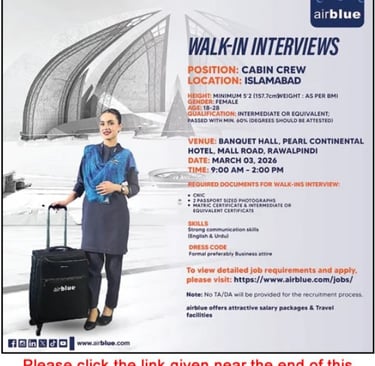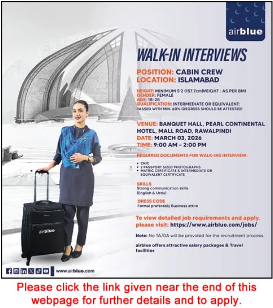 Please visit the link given below to Apply Online for Airhostess Jobs in Air Blue 2026 March Female Cabin Crew Walk in Interviews Latest: