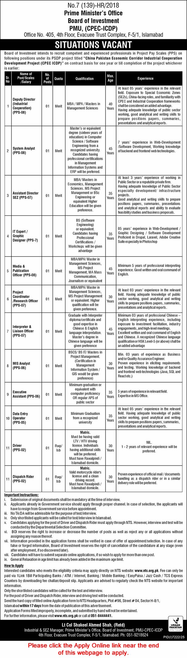 Board of Investment Islamabad Jobs 2026 March NTS Apply Online Prime Minister's Office