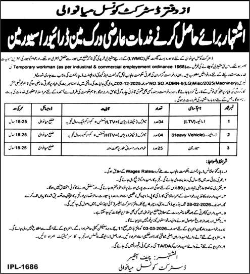 District Council Mianwali Driver & Sewerman Jobs 2026
