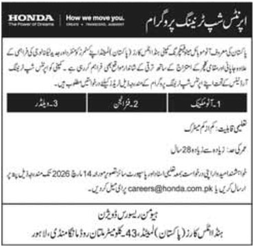 Apprenticeship Program in Honda Atlas Cars Pakistan 2026 March